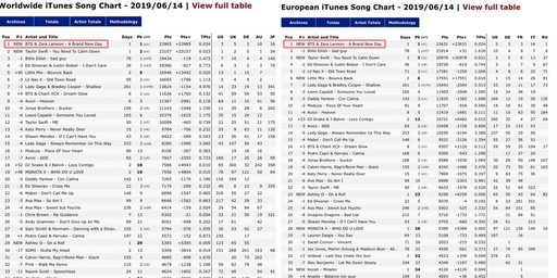 빌리 아일리시, 에드시런을 3, 4위로 밀어내는 기염을 토한 동시에 프랑스, 러시아, 스웨덴, 이집트, 불가리아, 헝가리 등 전 세계 63개국 아이튠즈 순위 1위를 석권하는 맹위를 떨쳤으며 유럽 1위, 미국 3위, 영국 5위의 놀라운 저력을 보여 주기도 했다.