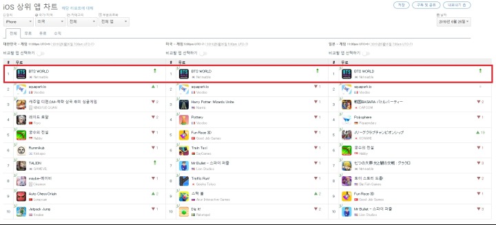 출시 5시간만인 어제 밤 12시경 한국과 미국, 일본 등을 비롯한 전 세계 모바일 게임 주요 시장 13개국 애플 앱스토어 인기 순위 1위에 처음 이름을 올린 BTS 월드는 현재 총 82개국에서 인기 순위 Top 5에 진입했다.
